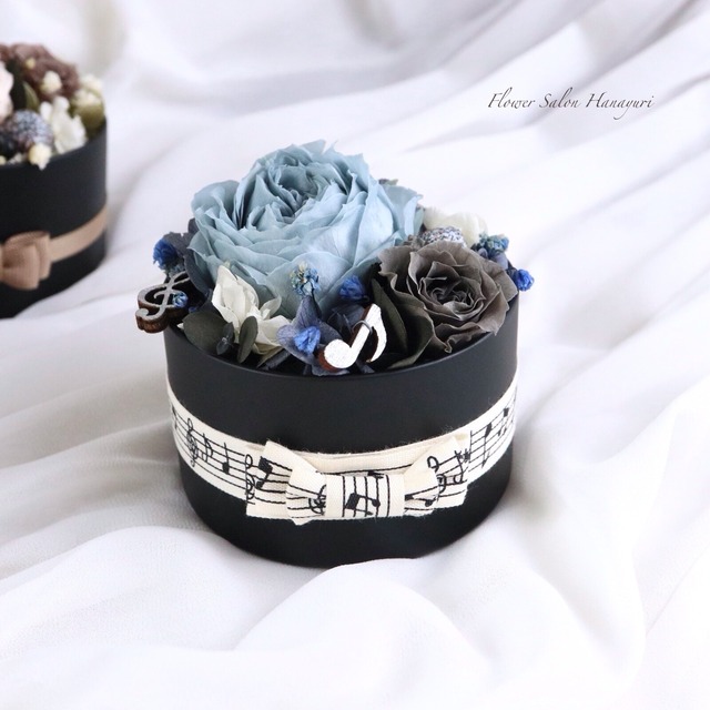 ボックスフラワー丸 ミストブルー 音符 五線譜 プリザーブドフラワー フラワーボックス オプション選べるお悔やみセット 置き型 ポットタイプ 誕生日記念日 お祝い お供え お悔やみ 仏花 ギフト