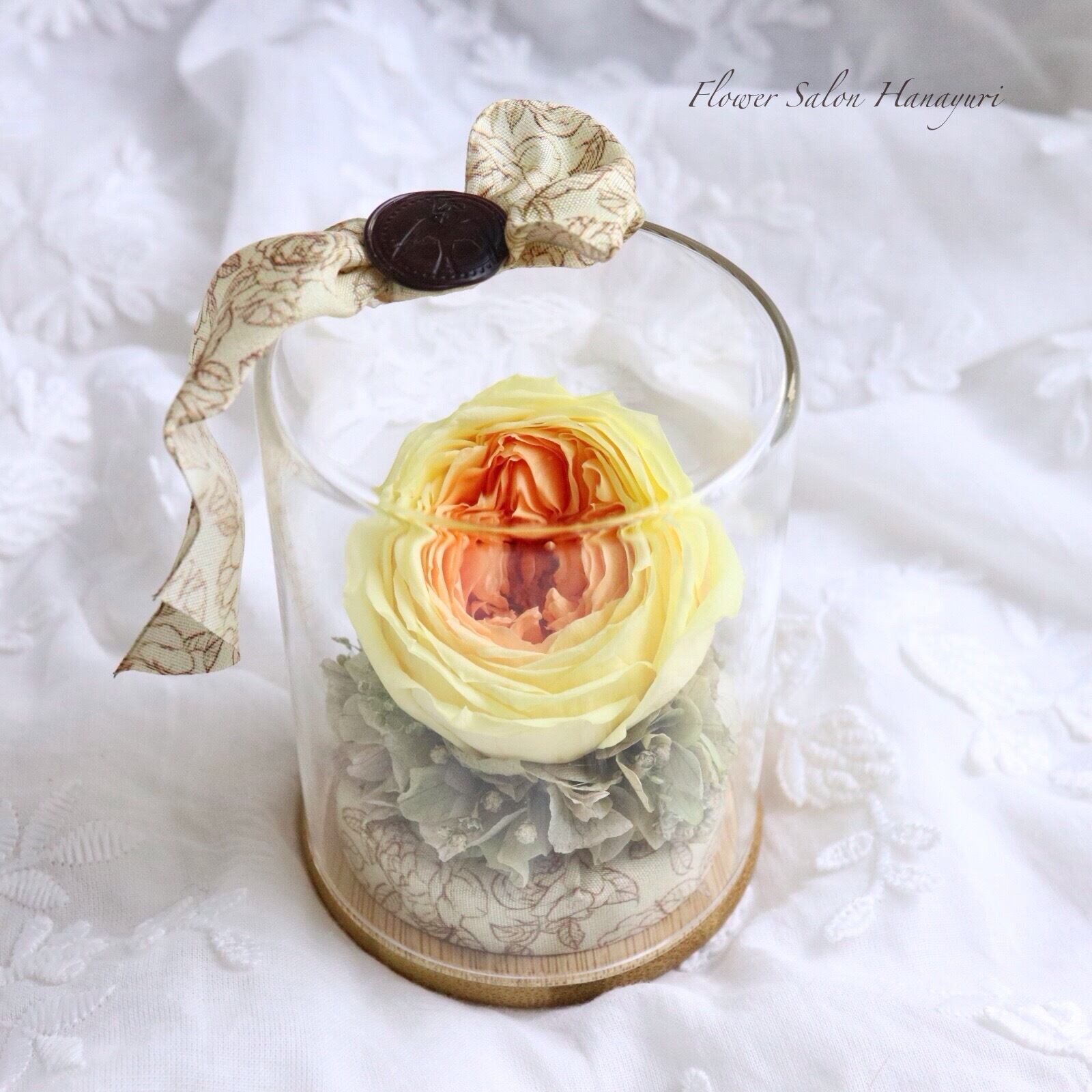 プリザーブドフラワー ボトルフラワー ガラスドーム オールドローズ イエローオレンジ バイカラー 記念日 誕生日 お祝い フラワーギフト お礼 選べるお悔やみオプション