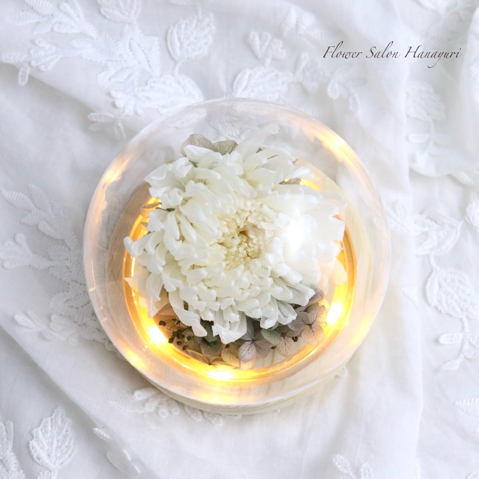 プリザーブドフラワー LEDライト付き ガラスドーム 輪菊 白 仏花 選べるお悔やみセット