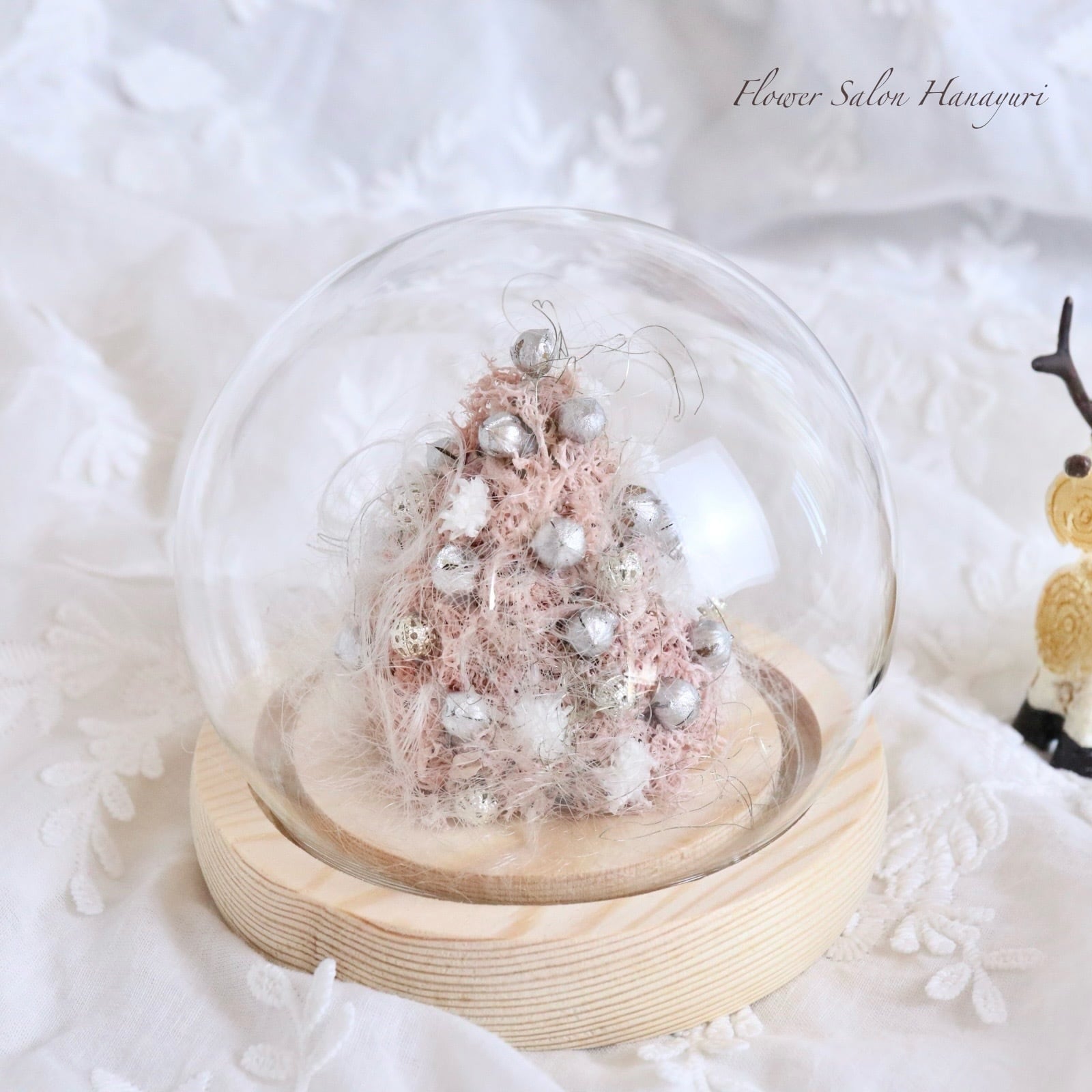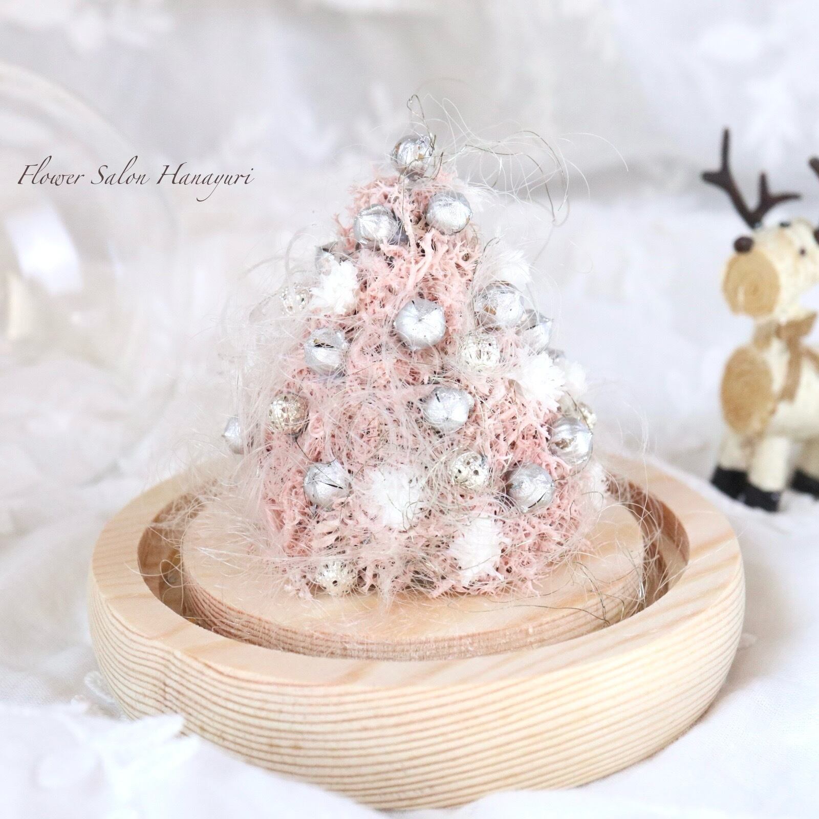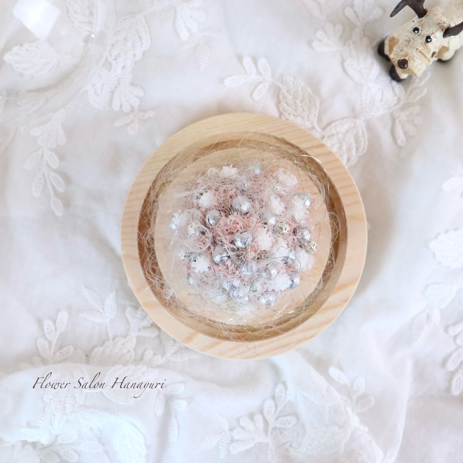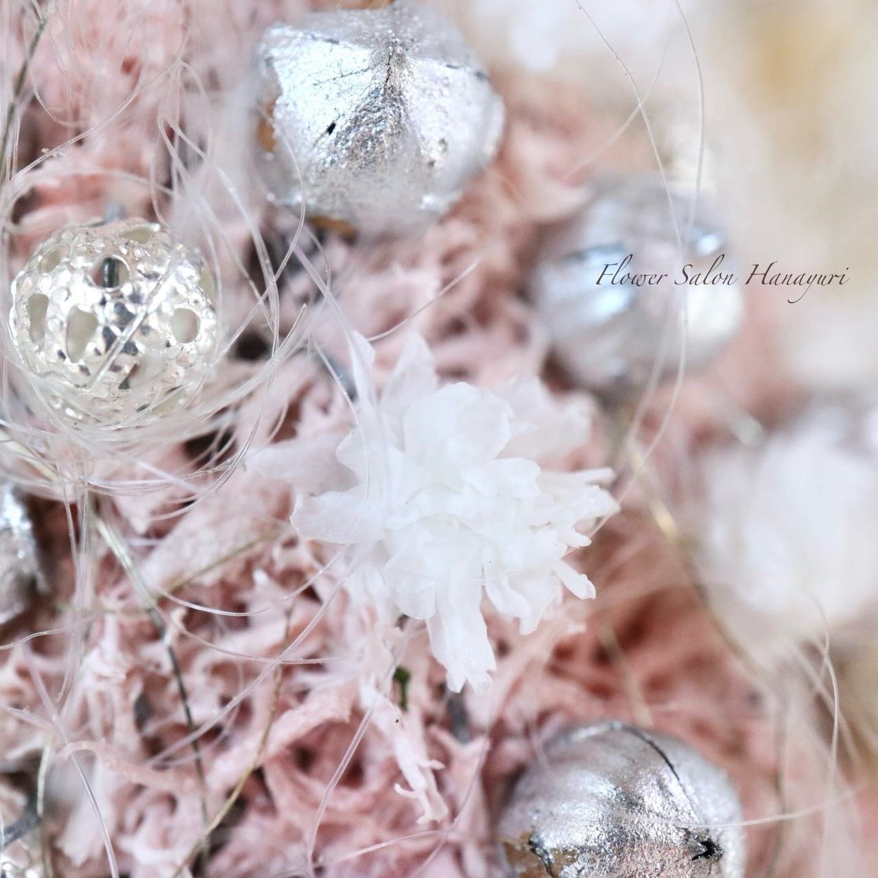 プリザーブドフラワーのピンクのモスに、綿雪のようなかすみ草やシルバーのリンフラワー、そしてシルバービーズをあしらいました。
