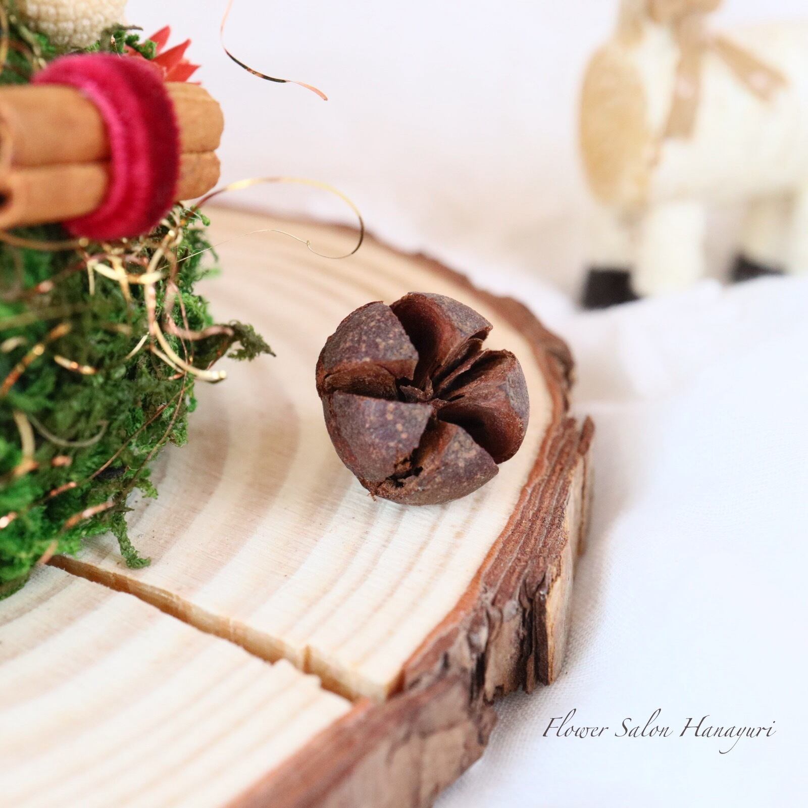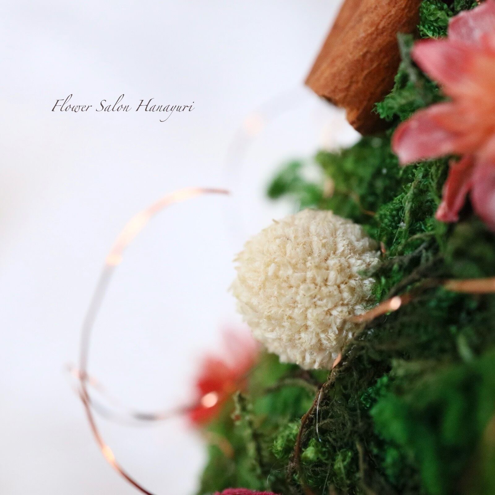 モスのツリーにボアフラワーやベルベットで包んだシナモン、スターフラワーで飾り付けました。