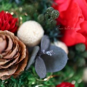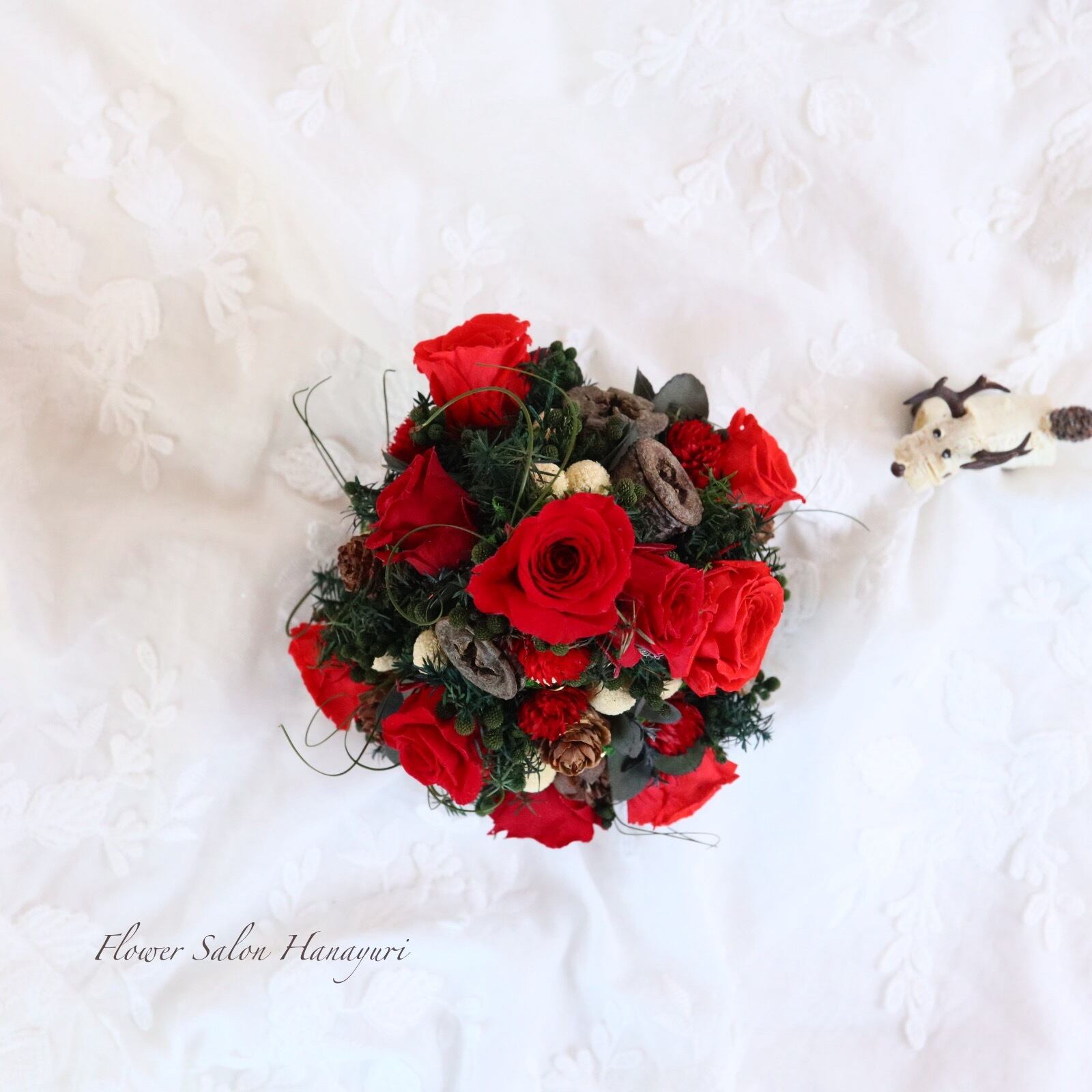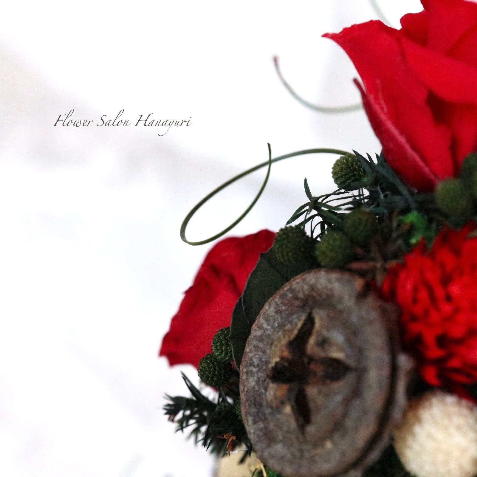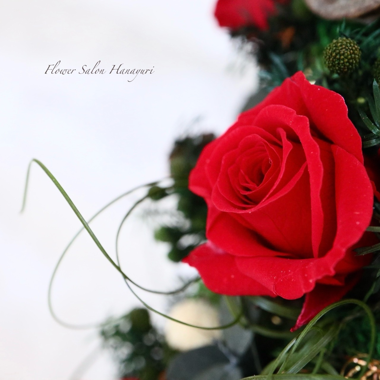 2色の赤薔薇に千日紅が華やかにツリーを彩り、カールした葉っぱで躍動感を持たせて生き生きとしたツリーに仕立てました。