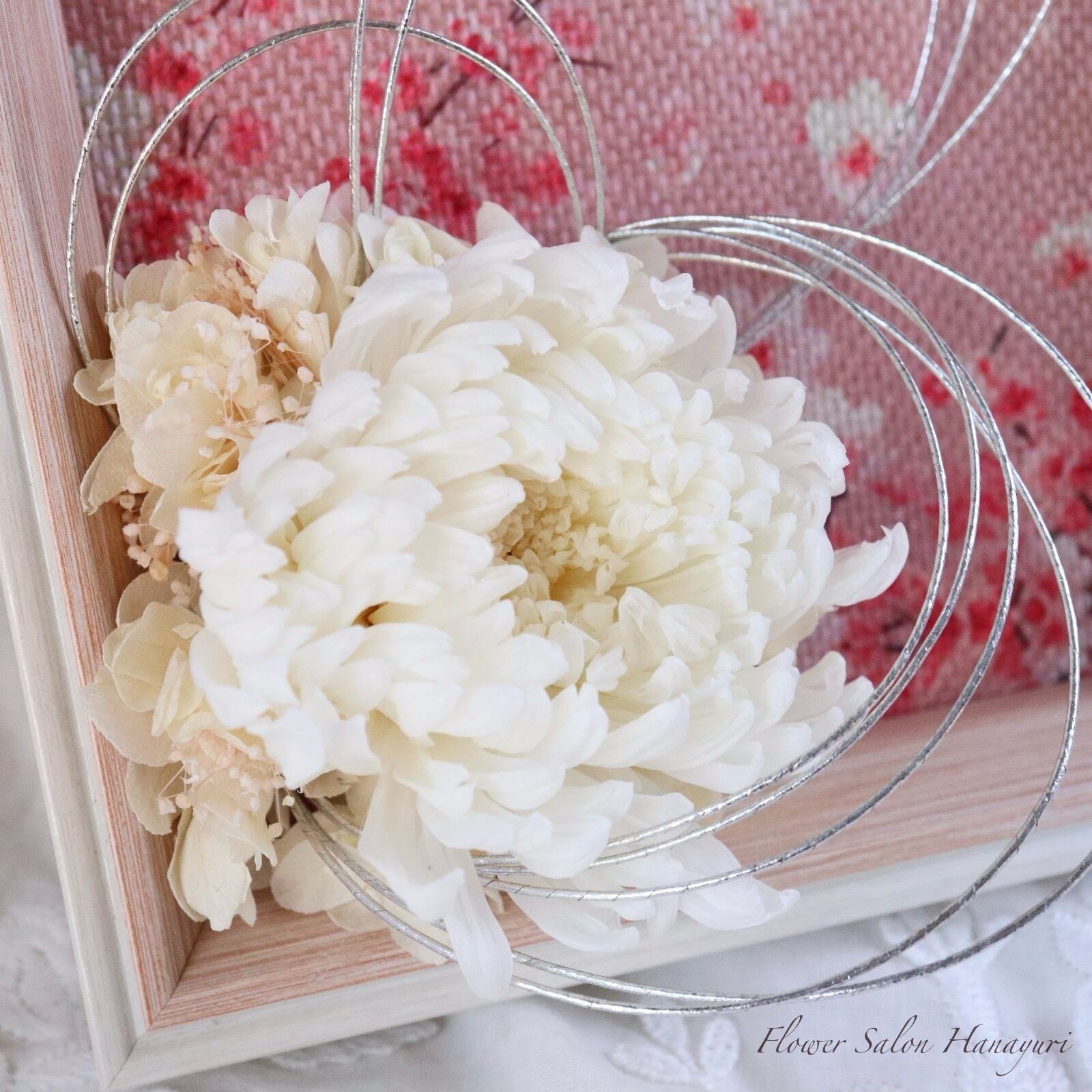 一輪の輪菊を銀の水引で引き立てた壁掛け兼用アレンジメントです。