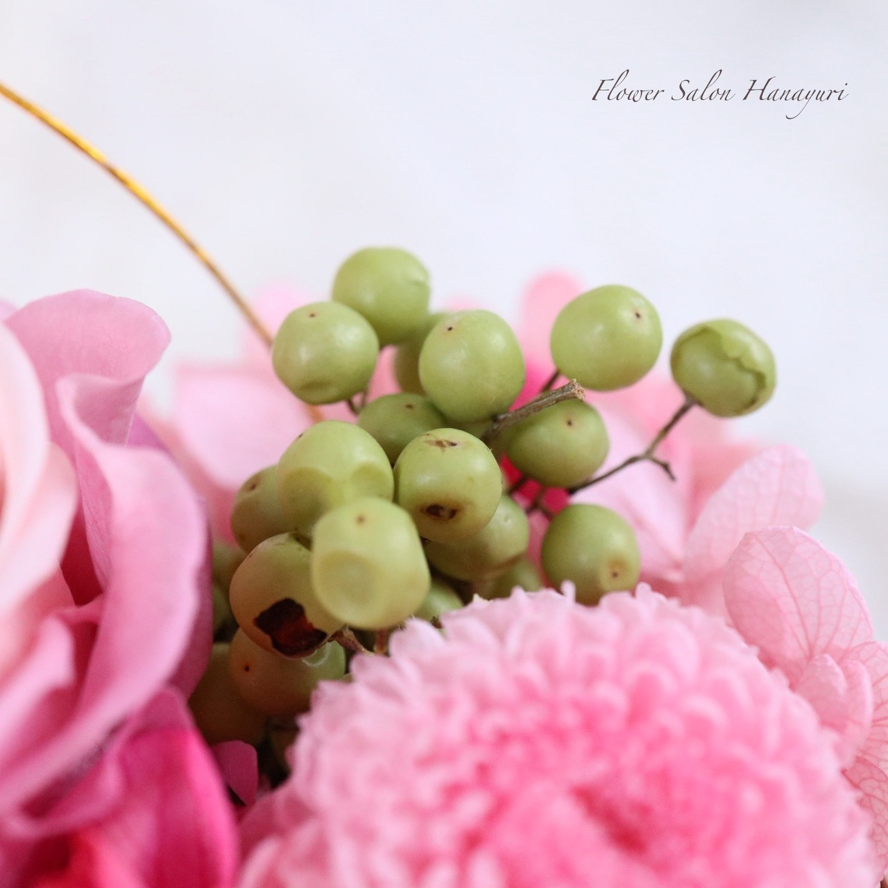 珍しいプリザーブドフラワーのグラデーションのピンクの薔薇にポンポンマム、グリーンのペッパーベリーが爽やかな印象です。