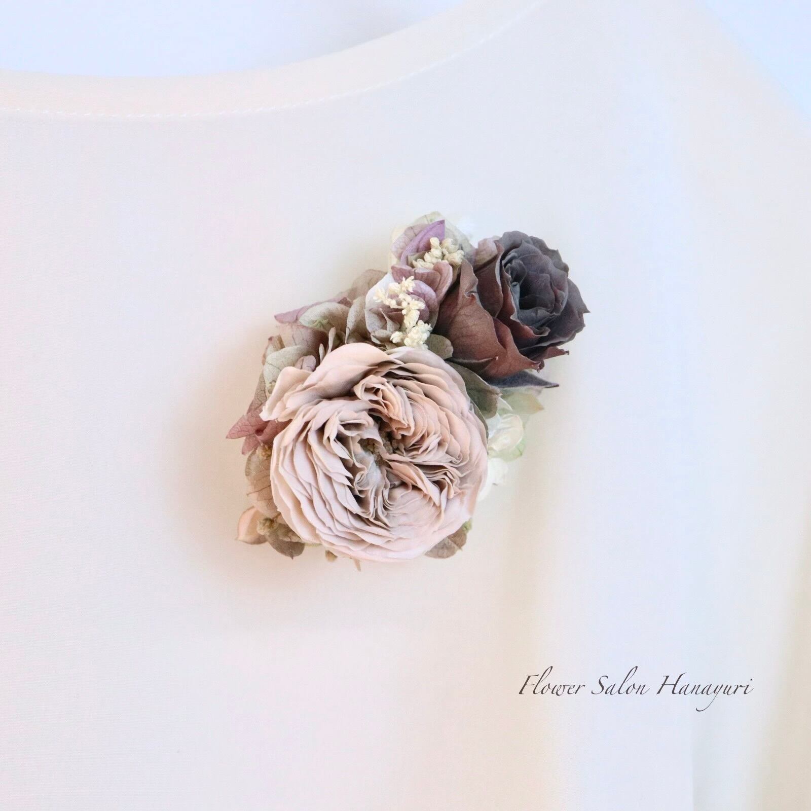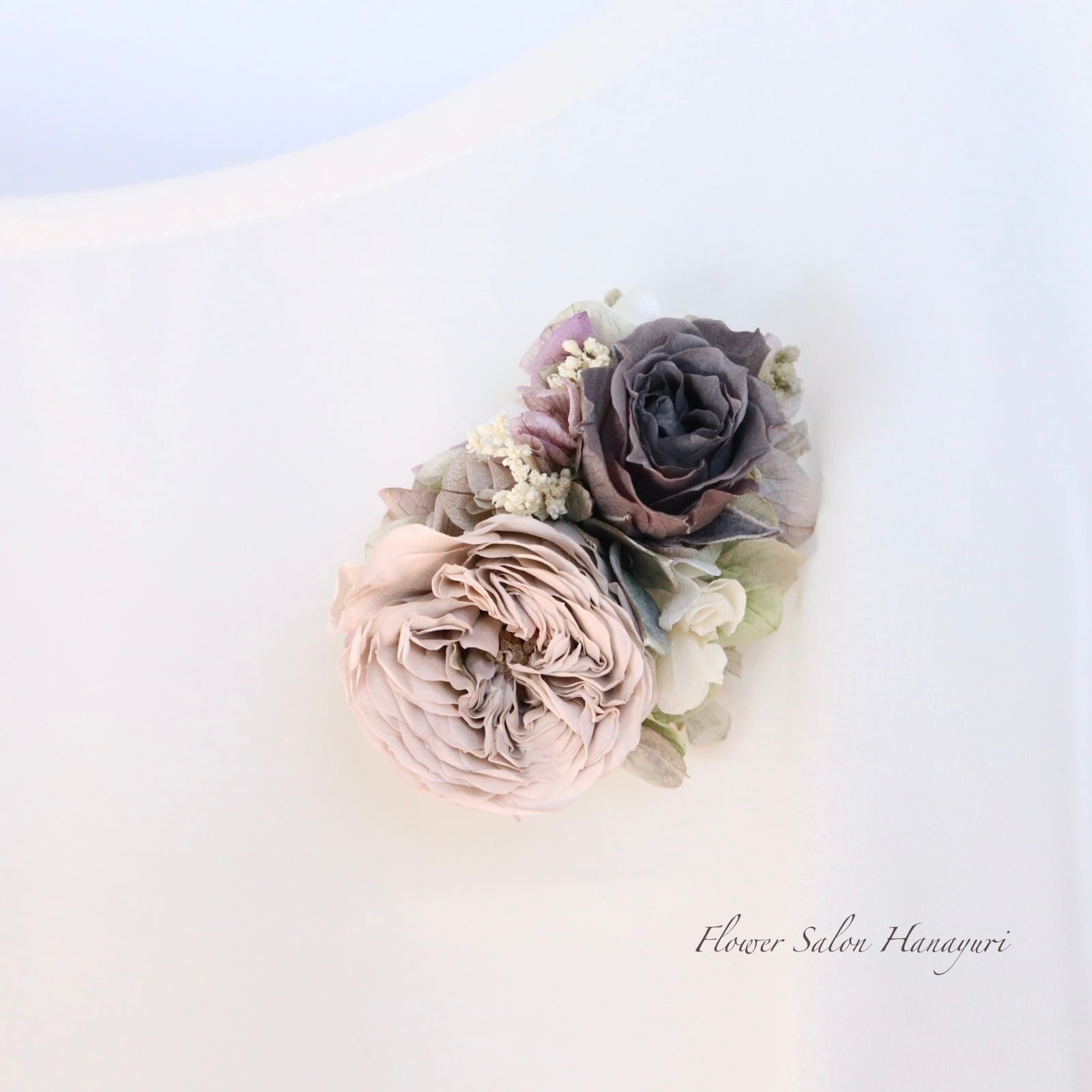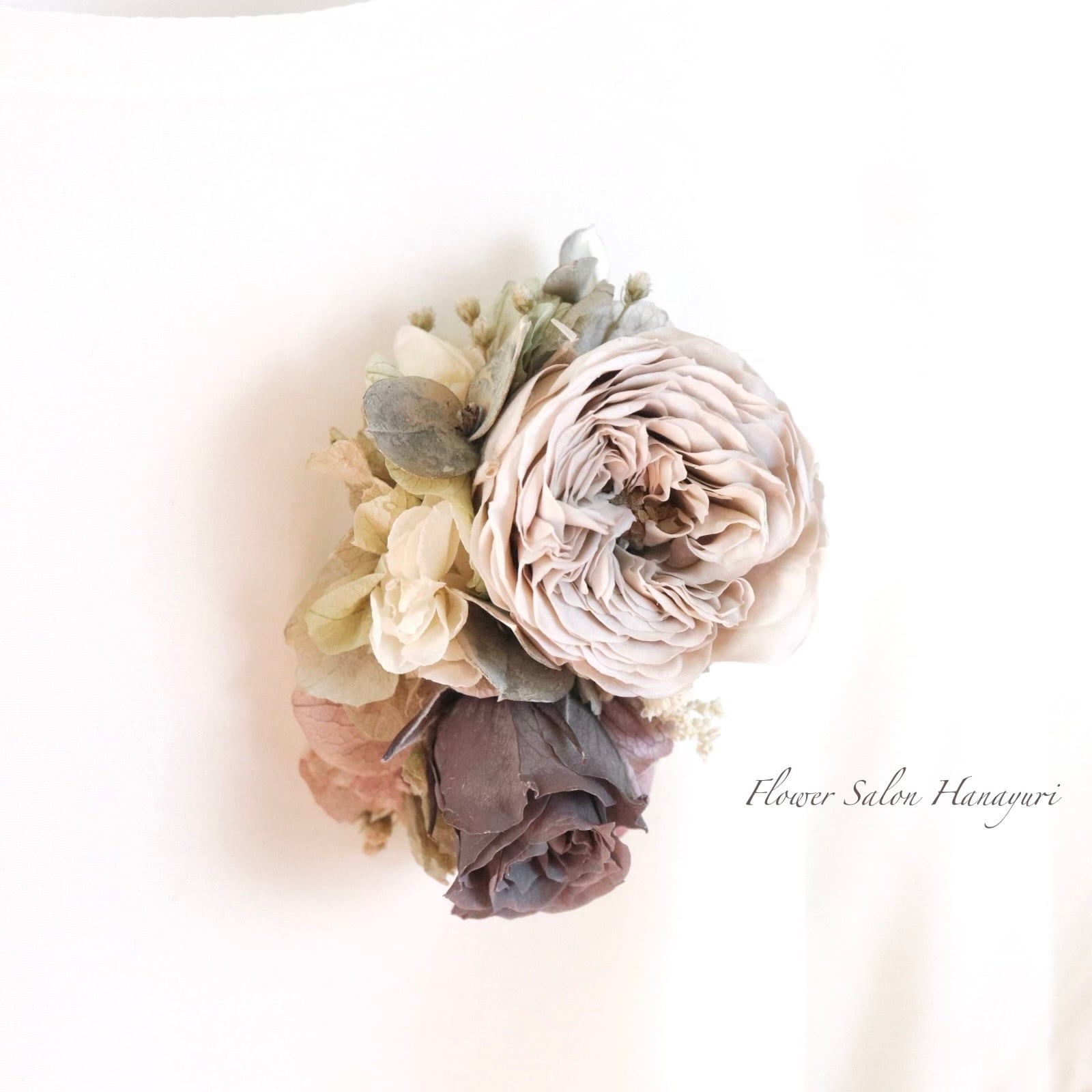 神秘的なサンドベージュ色に魅了されるオールドローズのコサージュです。