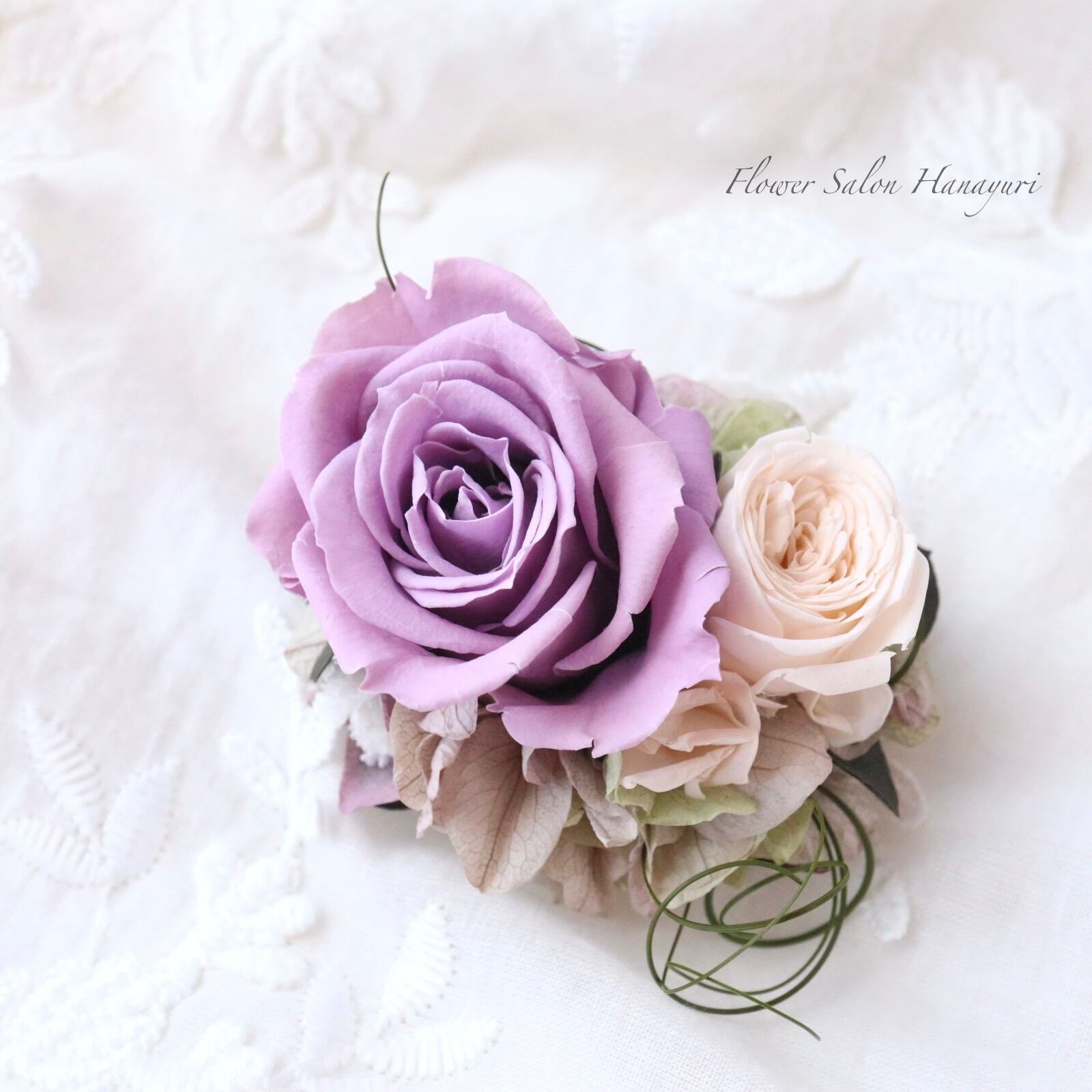 落ち着いたラベンダー色が緊張をほぐし安らぎを与えてくれるコサージュです。