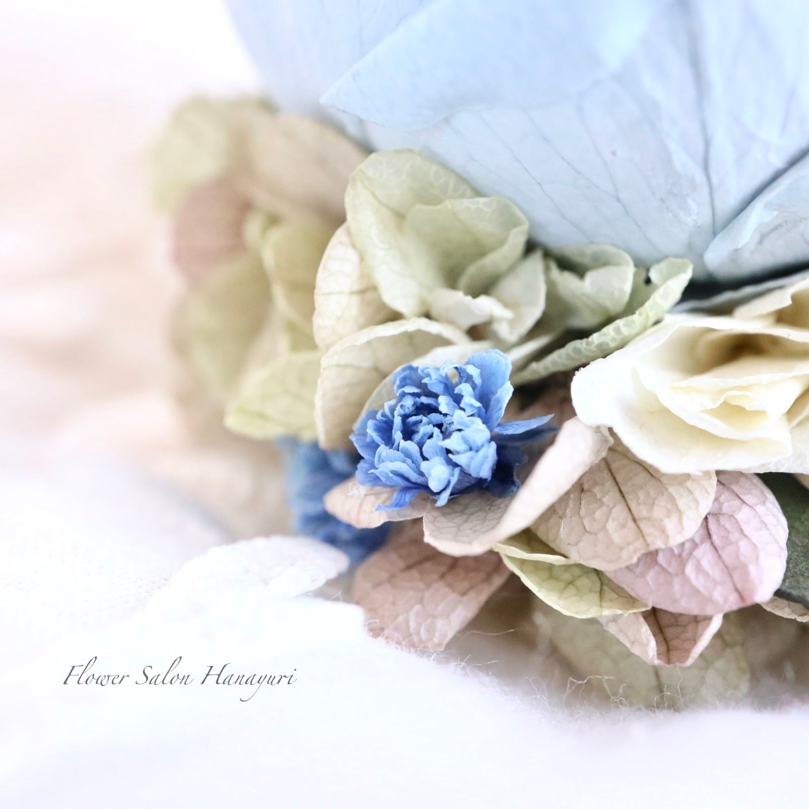 跳ねるように覗いたアンティークブルーのかすみ草が軽やかな印象です。