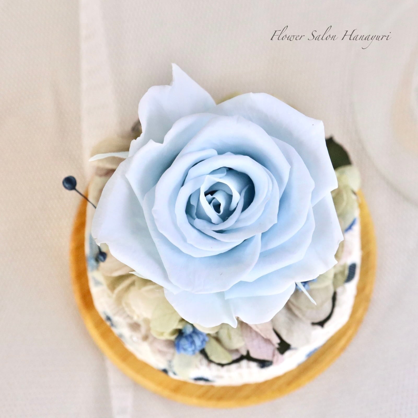 プリザーブドフラワー ボトルフラワー ガラスドーム パウダーブルー レースリボン 記念日 誕生日 お祝い フラワーギフト お礼 選べるお悔やみオプション