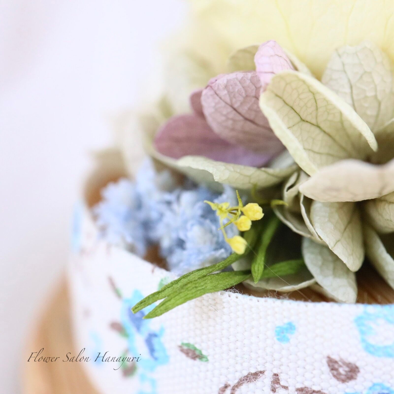 しっとりとした美しさを持つオレガノパープルの紫陽花に淡いブルーと黄色の小花を合わせ、ブラウンのシーリングスタンプと相まってクラシカルな雰囲気を持ち合わすフラワーアレンジメントです。