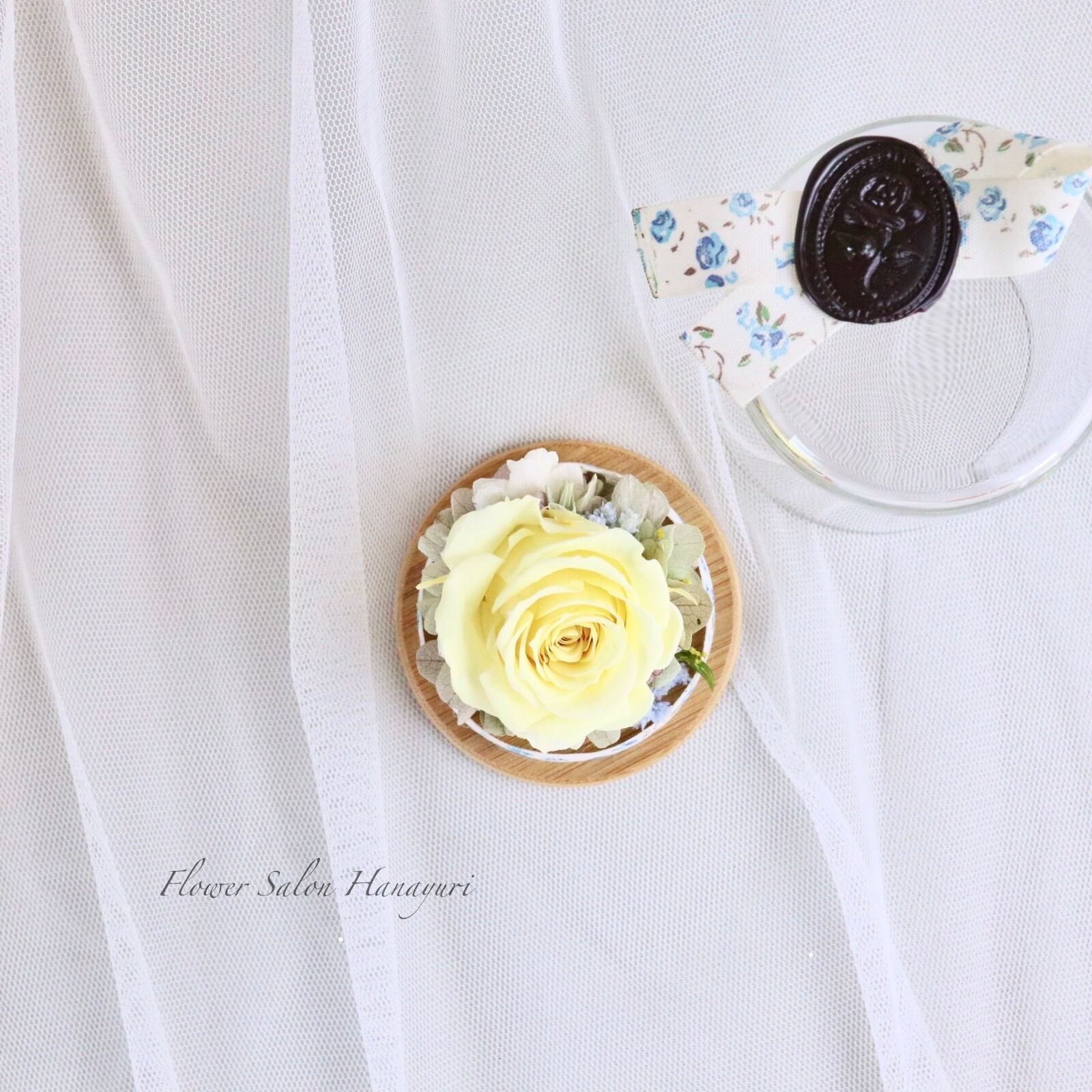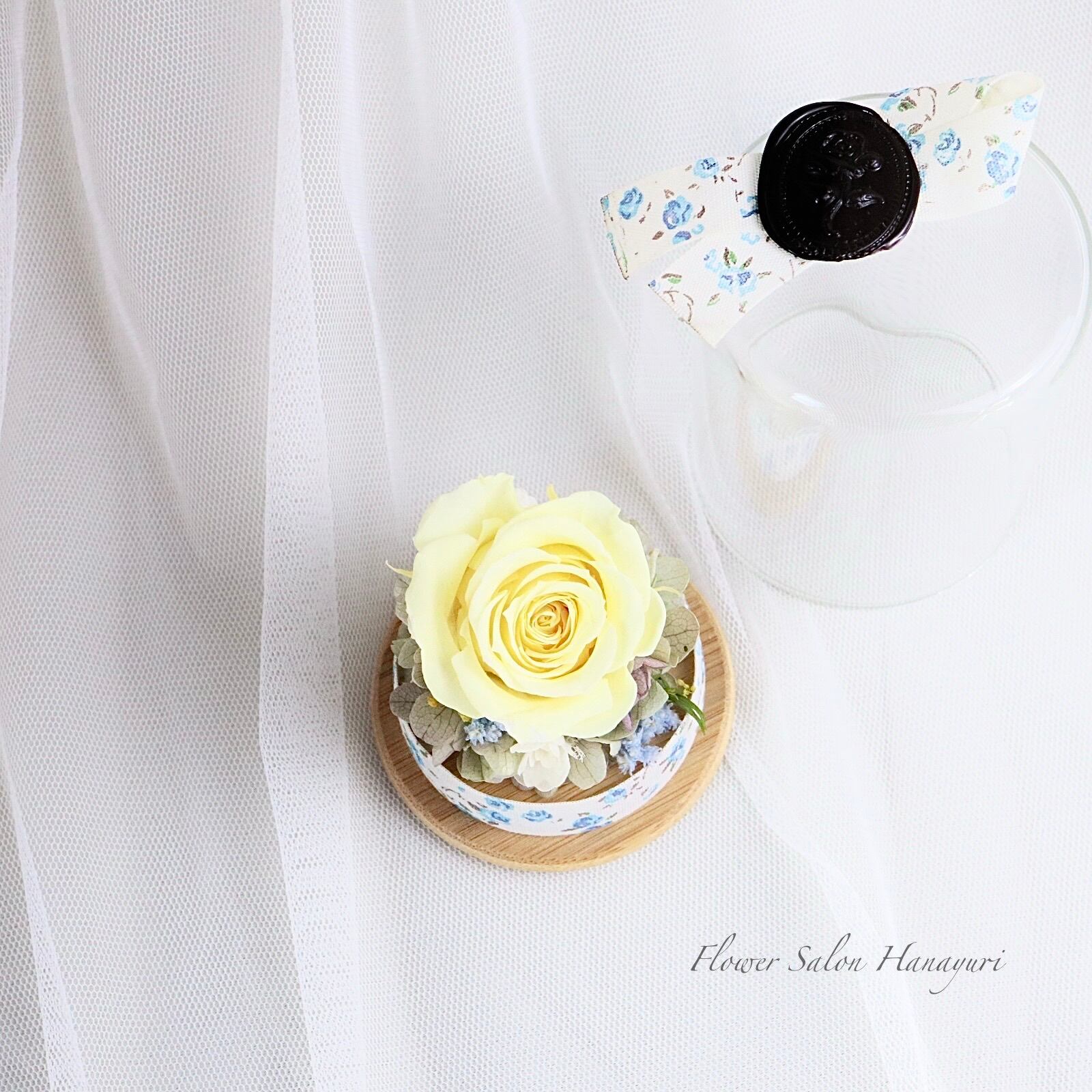 淡い黄色の薔薇とブルーローズ柄のリボンがナチュラルな一輪ボトルフラワーです。