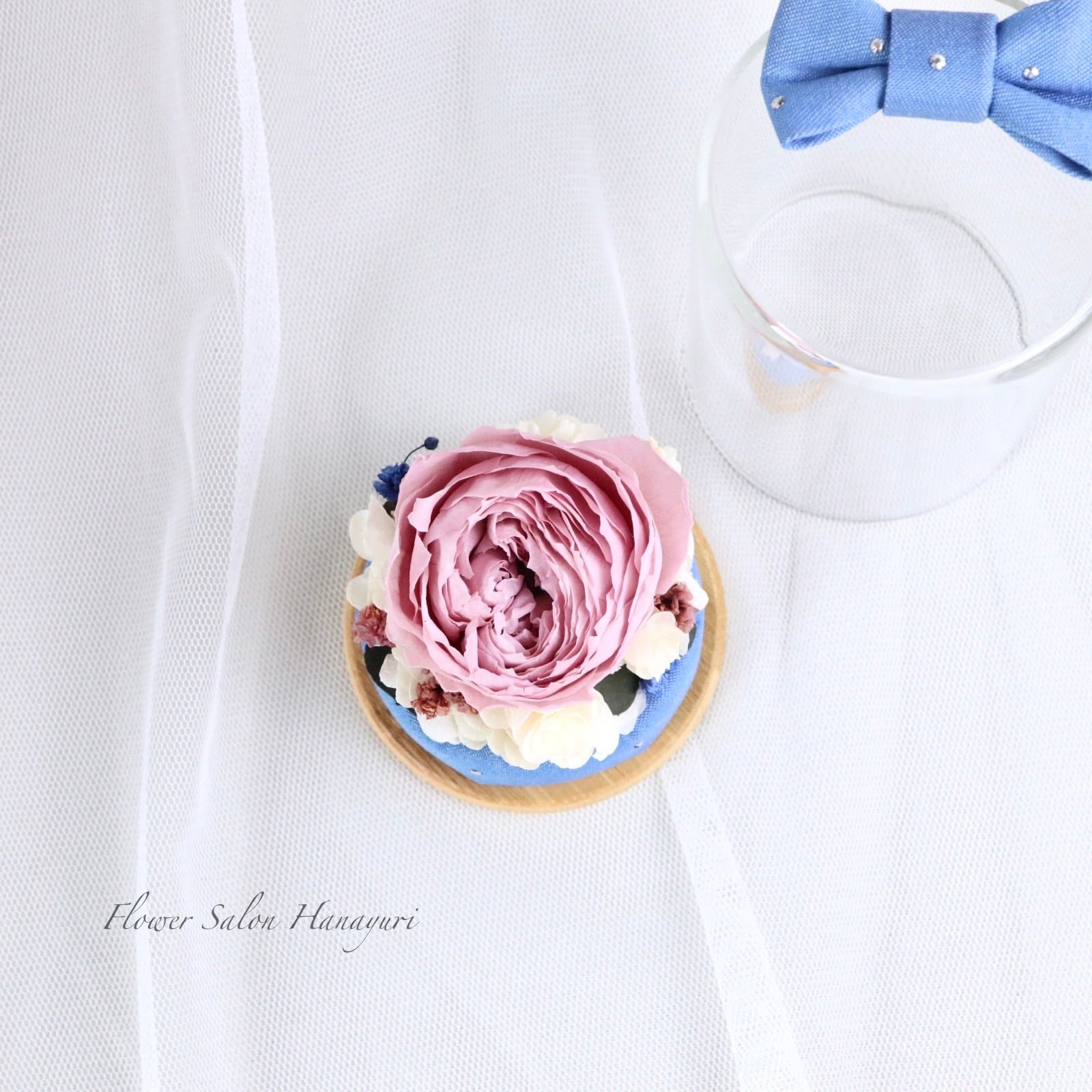 デニムのようなブルーにラインストーンが付いたきれい系カジュアルなリボンを合わせた大人かわいいフラワーアレンジメントです。