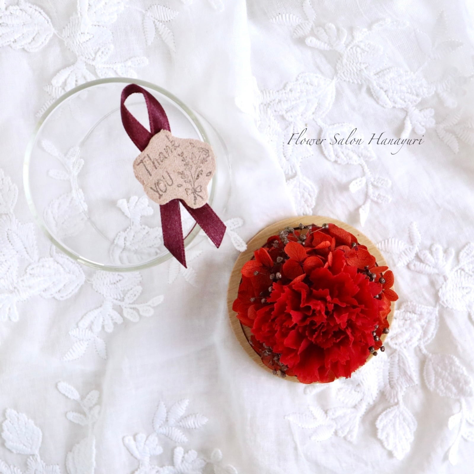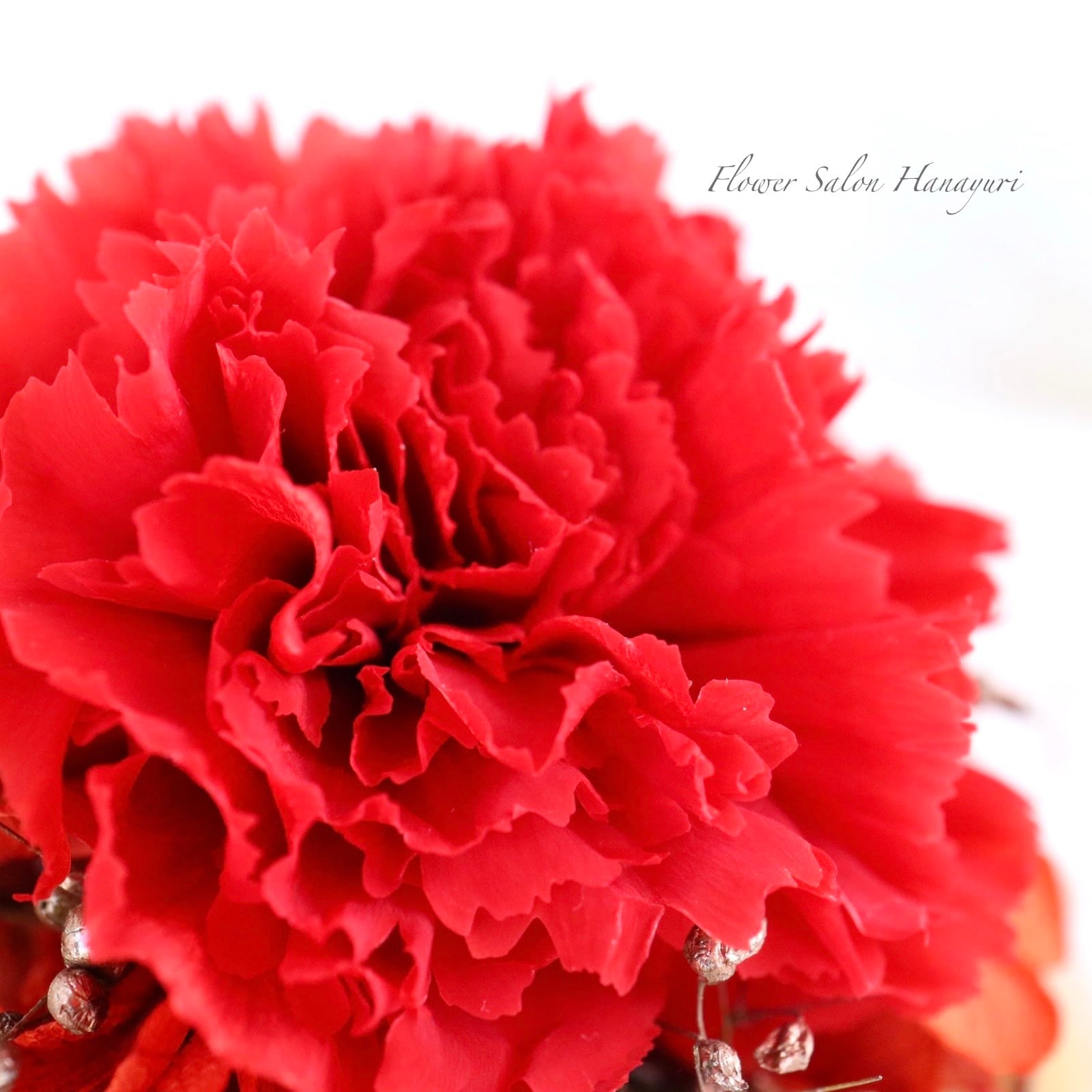 真っ赤なカーネーションに赤い紫陽花とシックなマットゴールのかすみ草を合わせました。