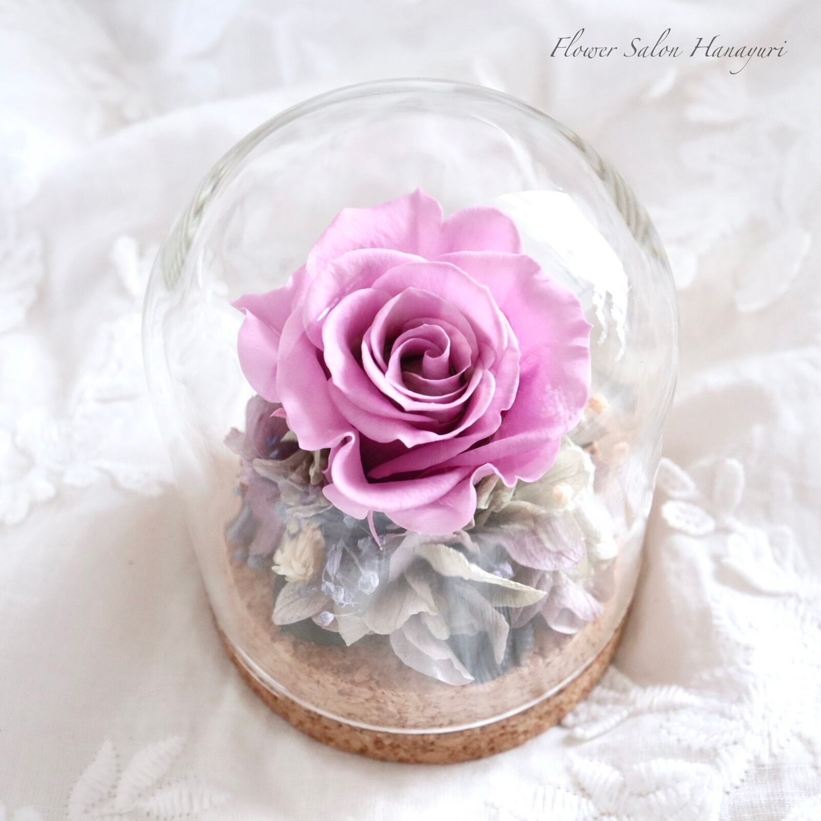 ガラスのボトルフラワーは埃を防ぎ、色褪せも遅らせてくれますので直射日光に注意すれば何年もの長い間飾っていただけます。