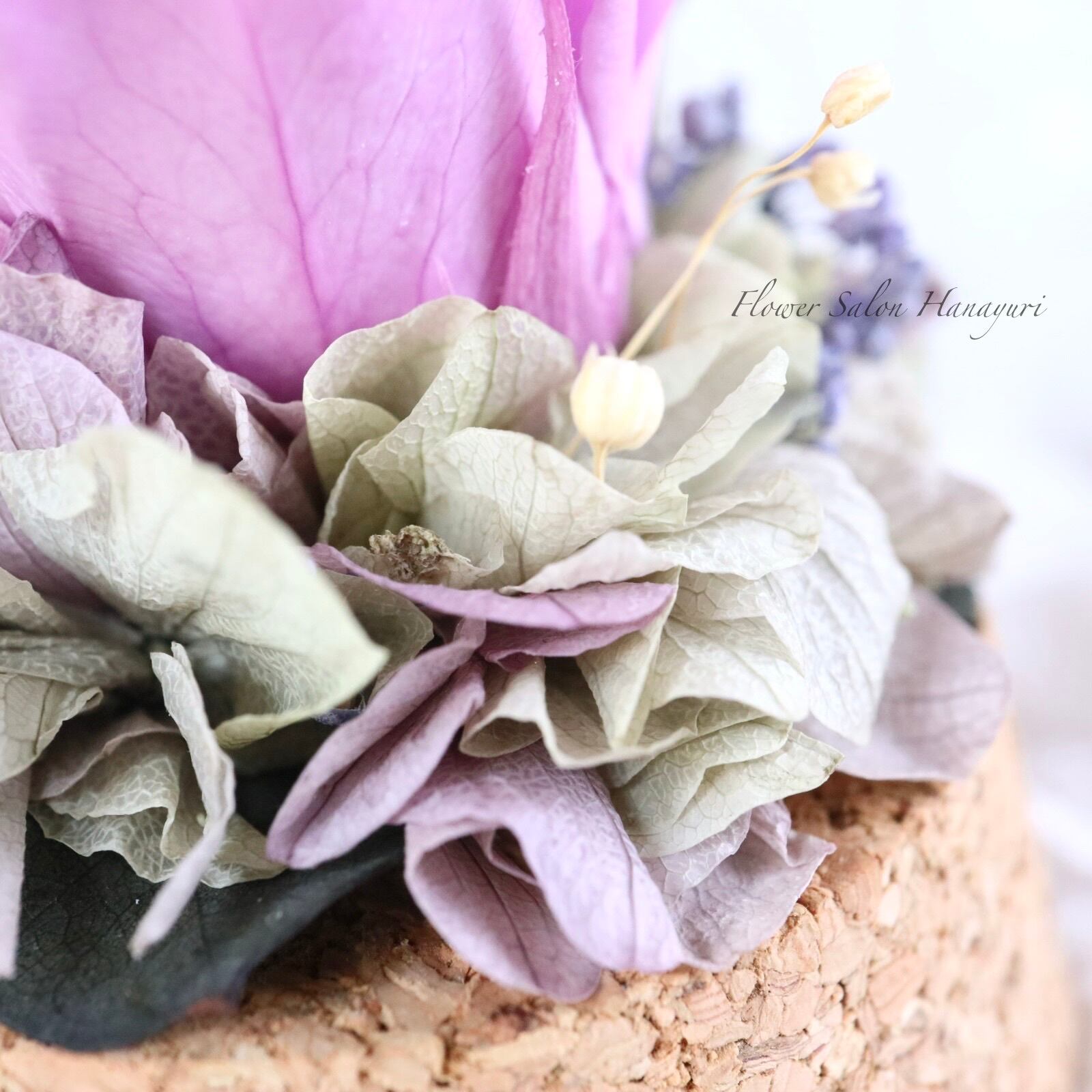 生花のようにみずみずしく、繊細なお花です。お花にひびや切れ目、実物など落ちやすいものもございますが、プリザーブドフラワーの特性上ものですのでご了承くださいませ。