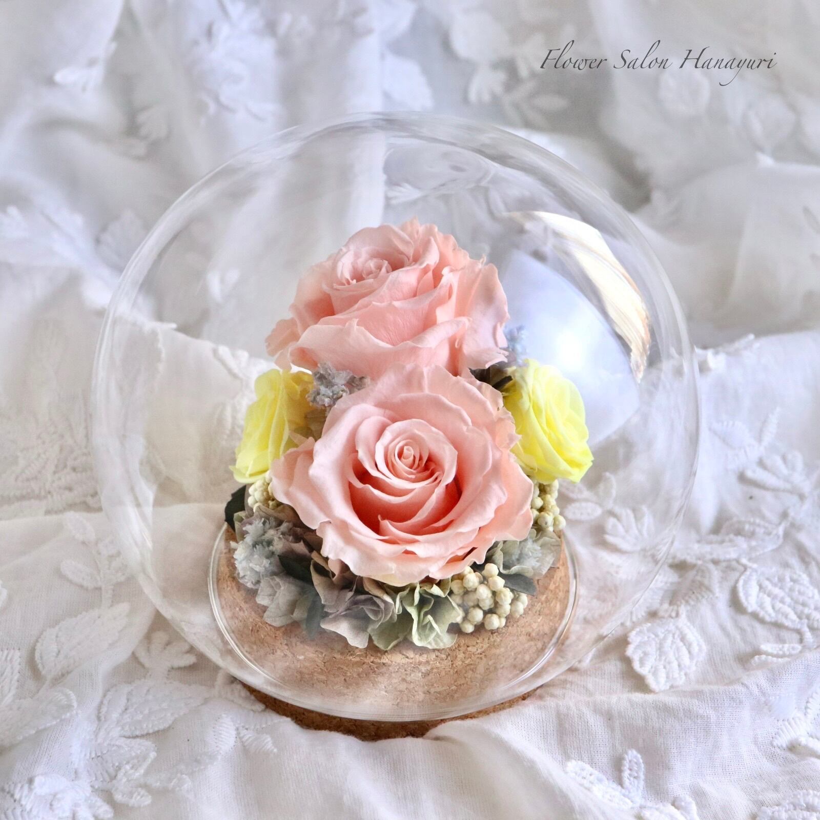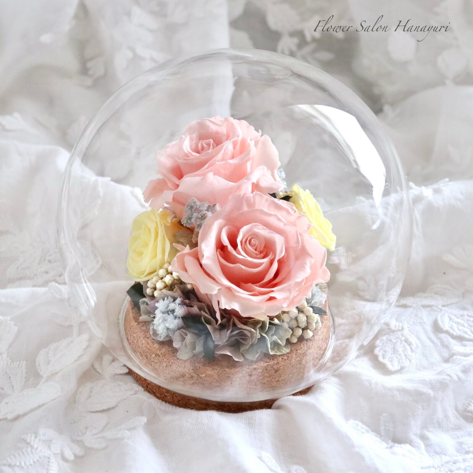 10年以上もお楽しみいただけるガラスの中のプリザーブドフラワー。