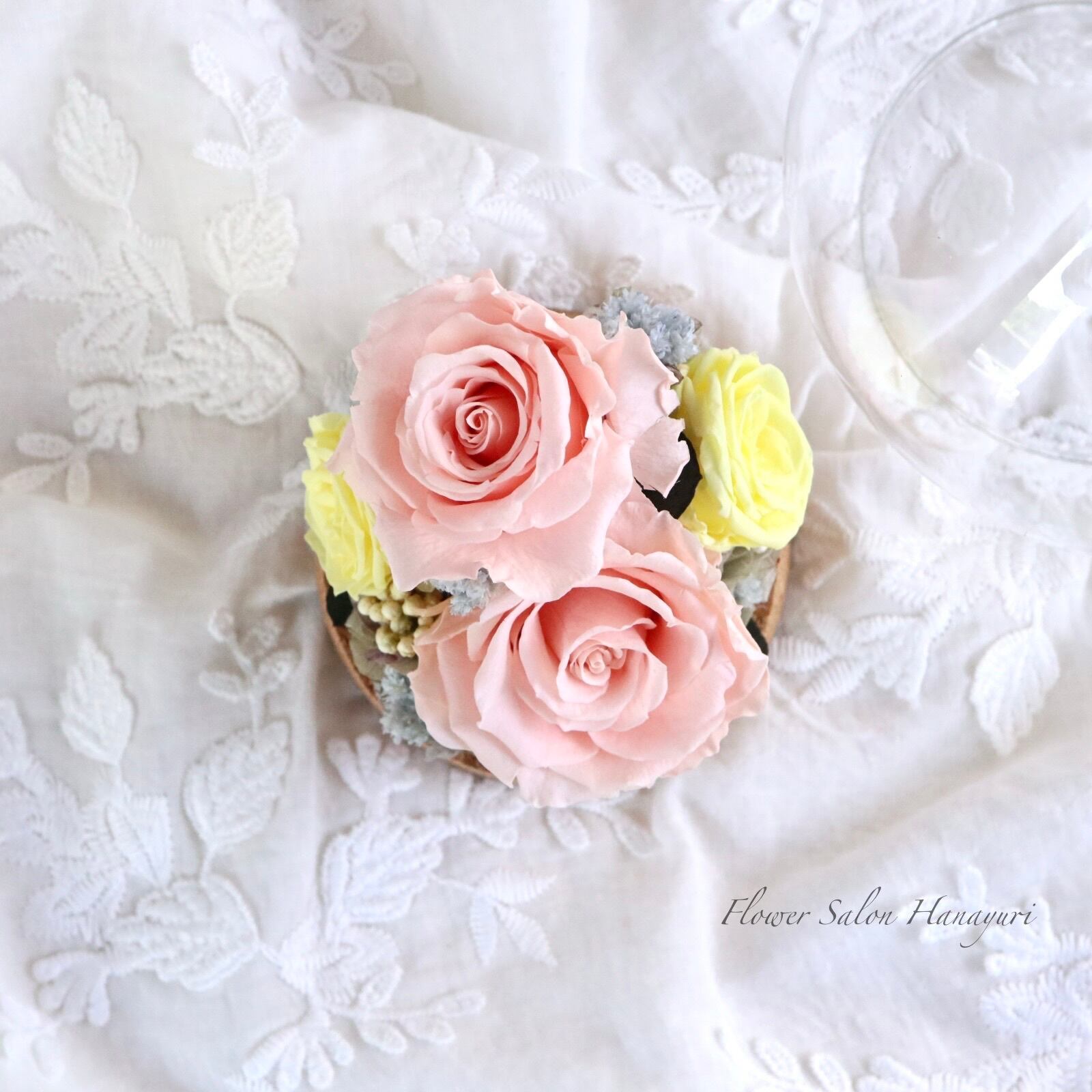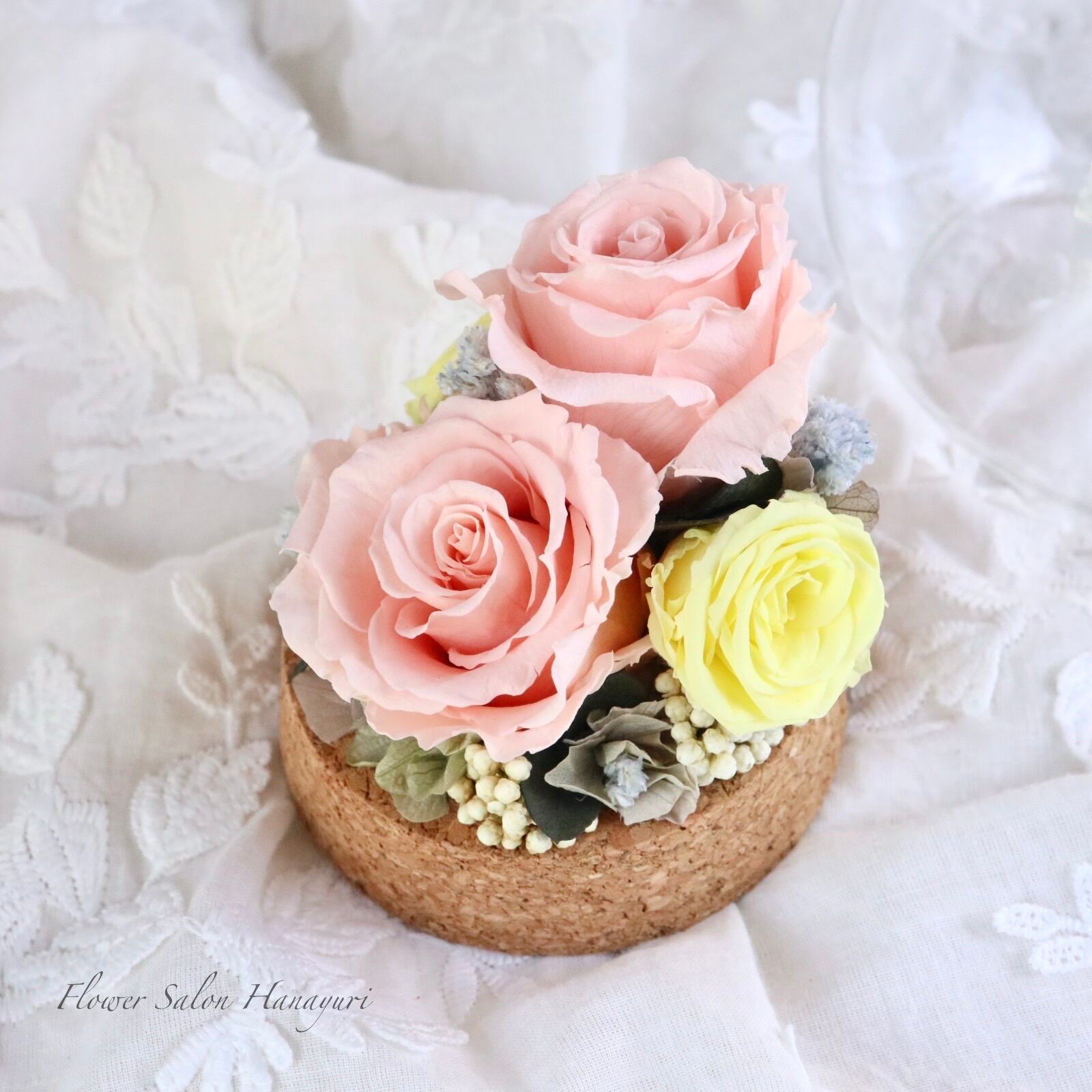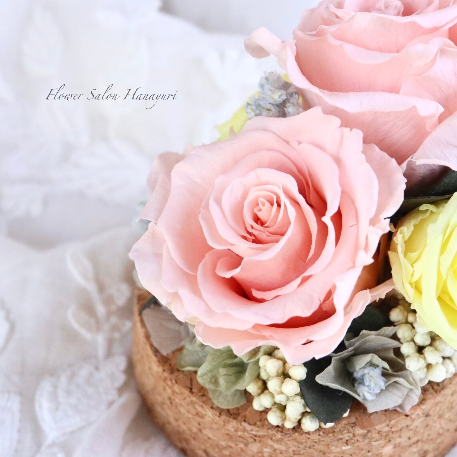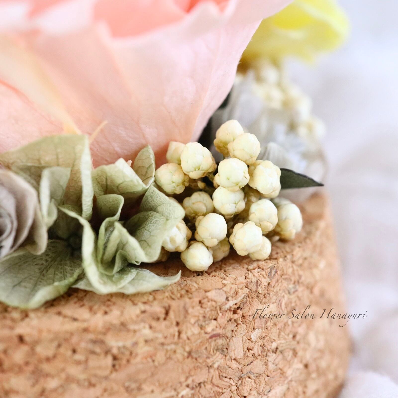 生花のようにみずみずしく、繊細なお花です。お花にひびや切れ目、実物など落ちやすいものもございますが、プリザーブドフラワーの特性上ものですのでご了承くださいませ。
