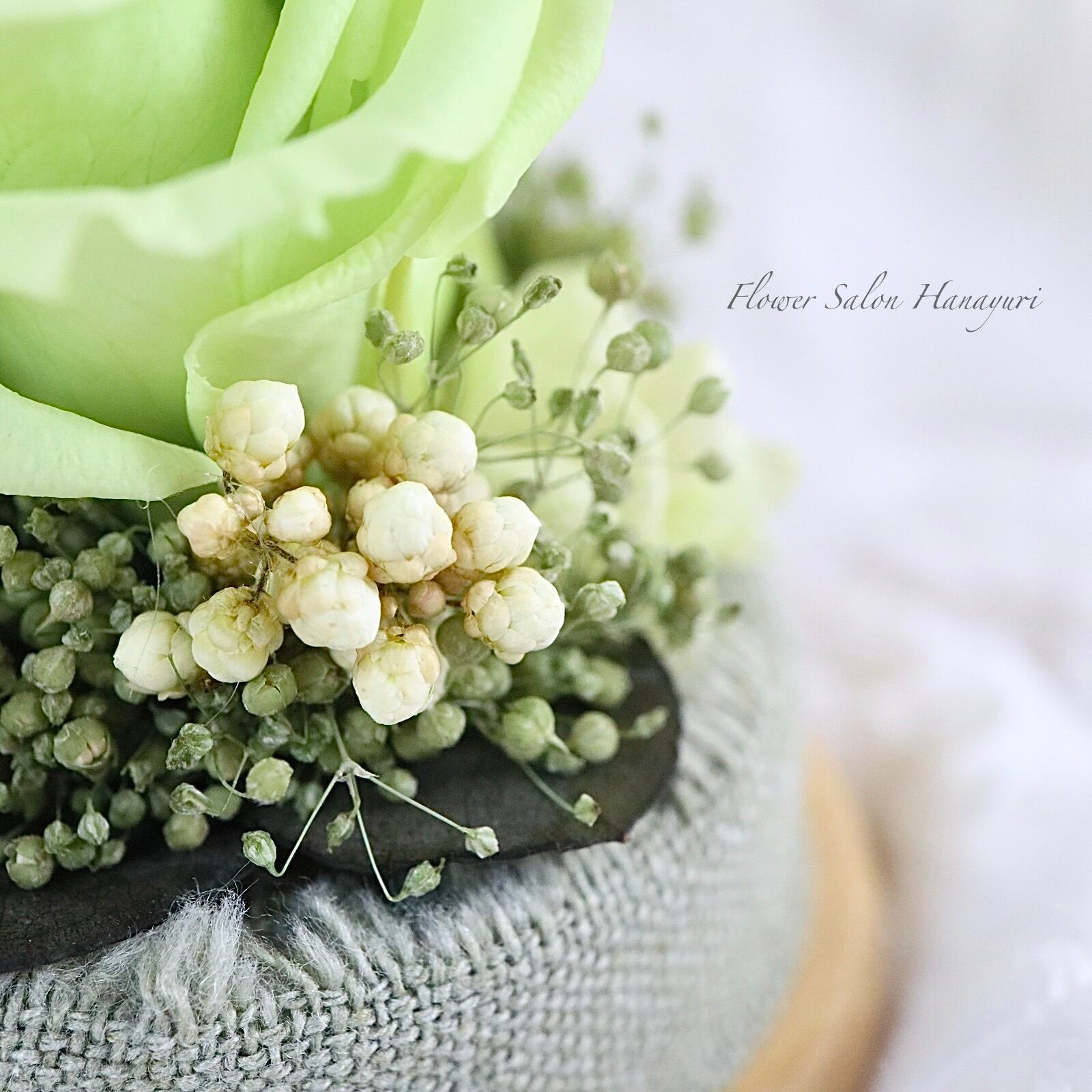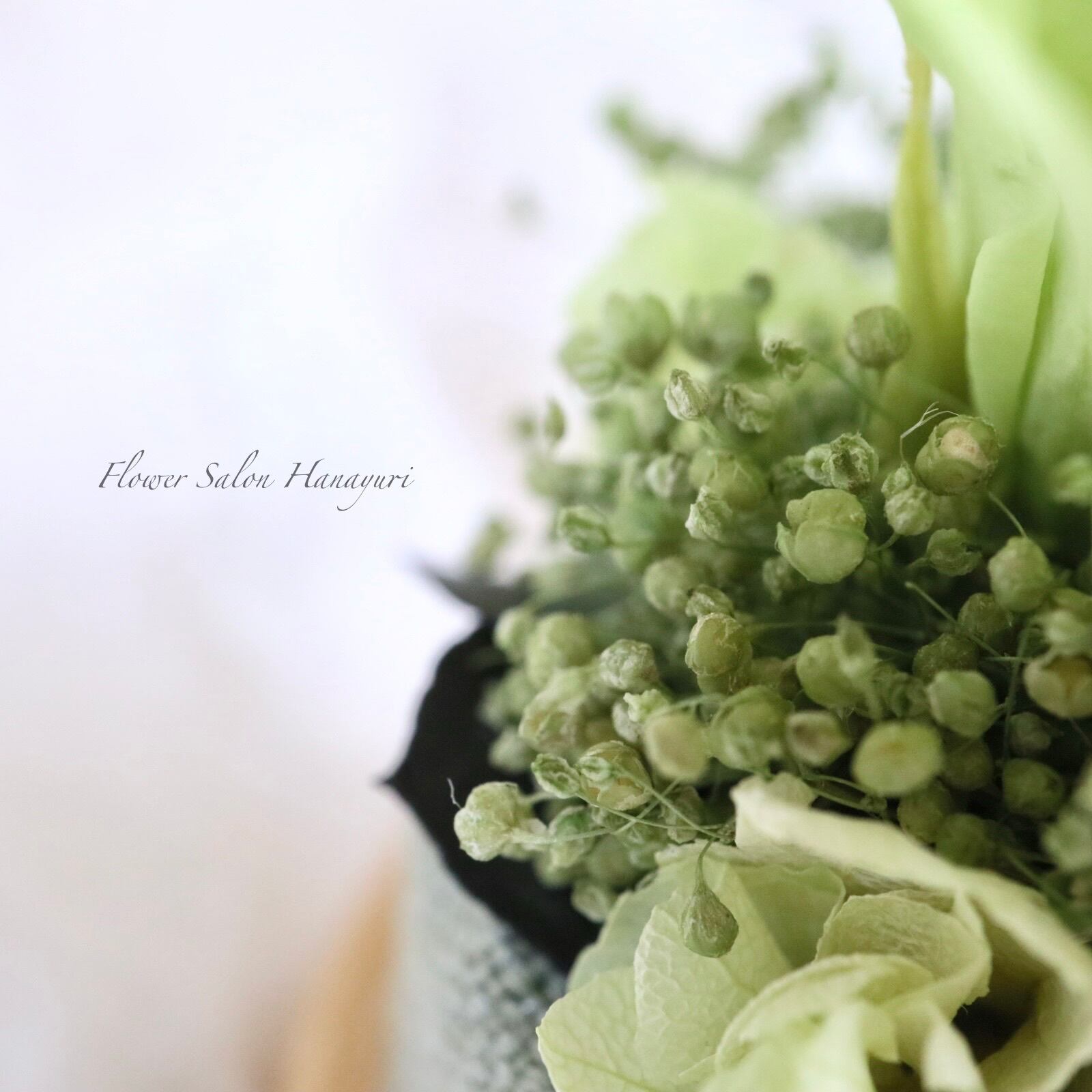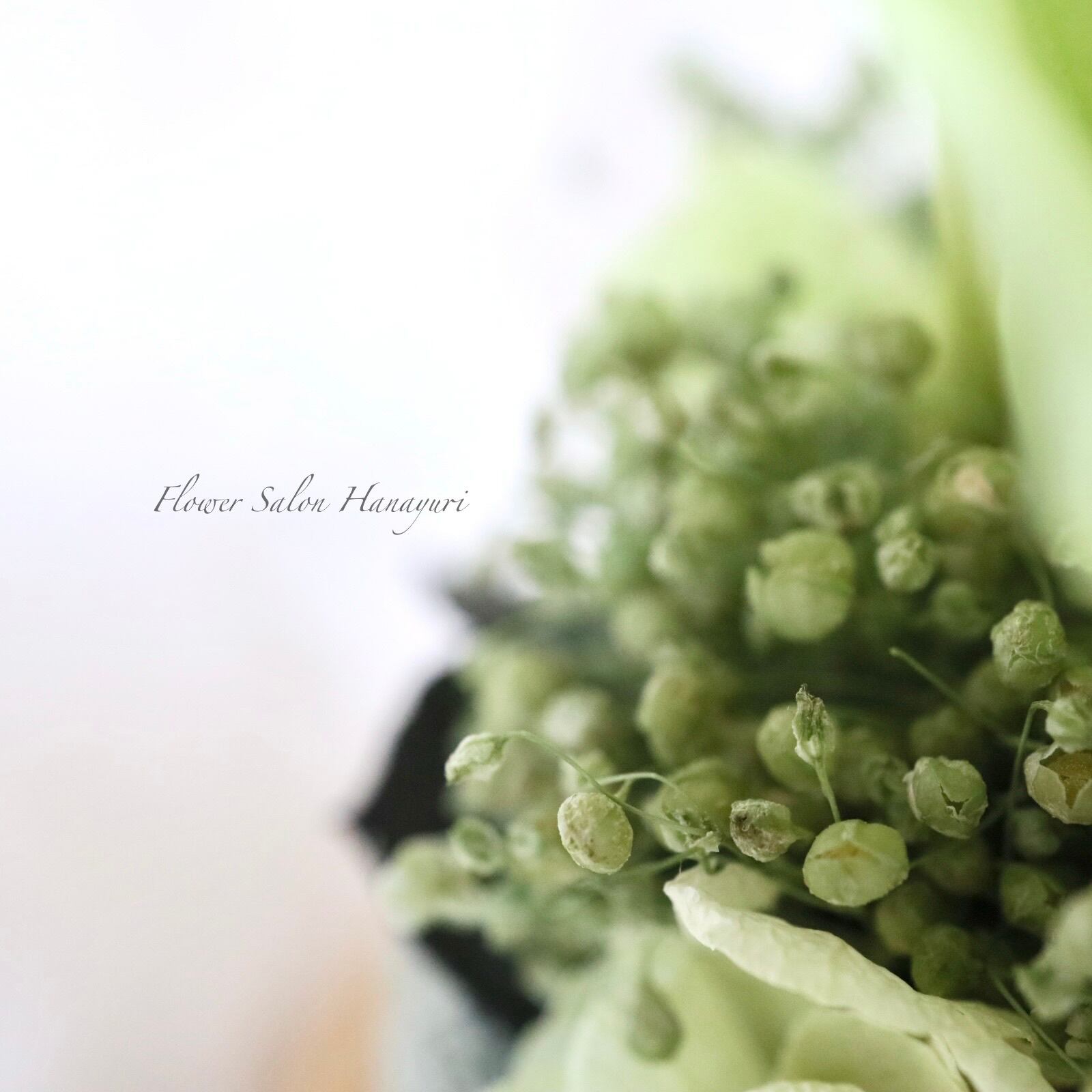 くすみグリーンのかすみ草は細かく分けてから丁寧に束ね、ひと束のブーケをたくさんアレンジいたしました。