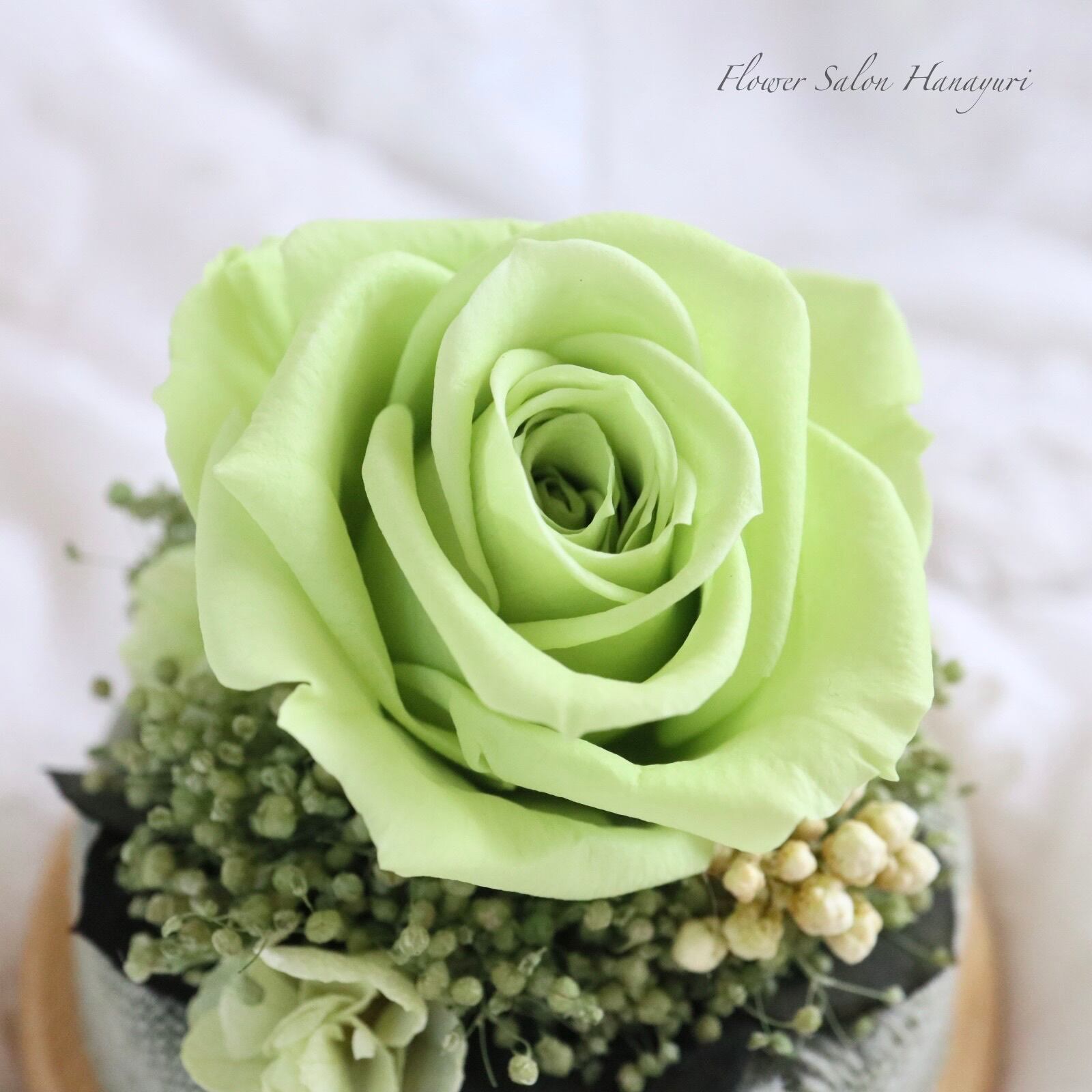 生花のようにみずみずしく、繊細なお花です。お花にひびや切れ目、実物など落ちやすいものもございますが、プリザーブドフラワーの特性上ものですのでご了承くださいませ。