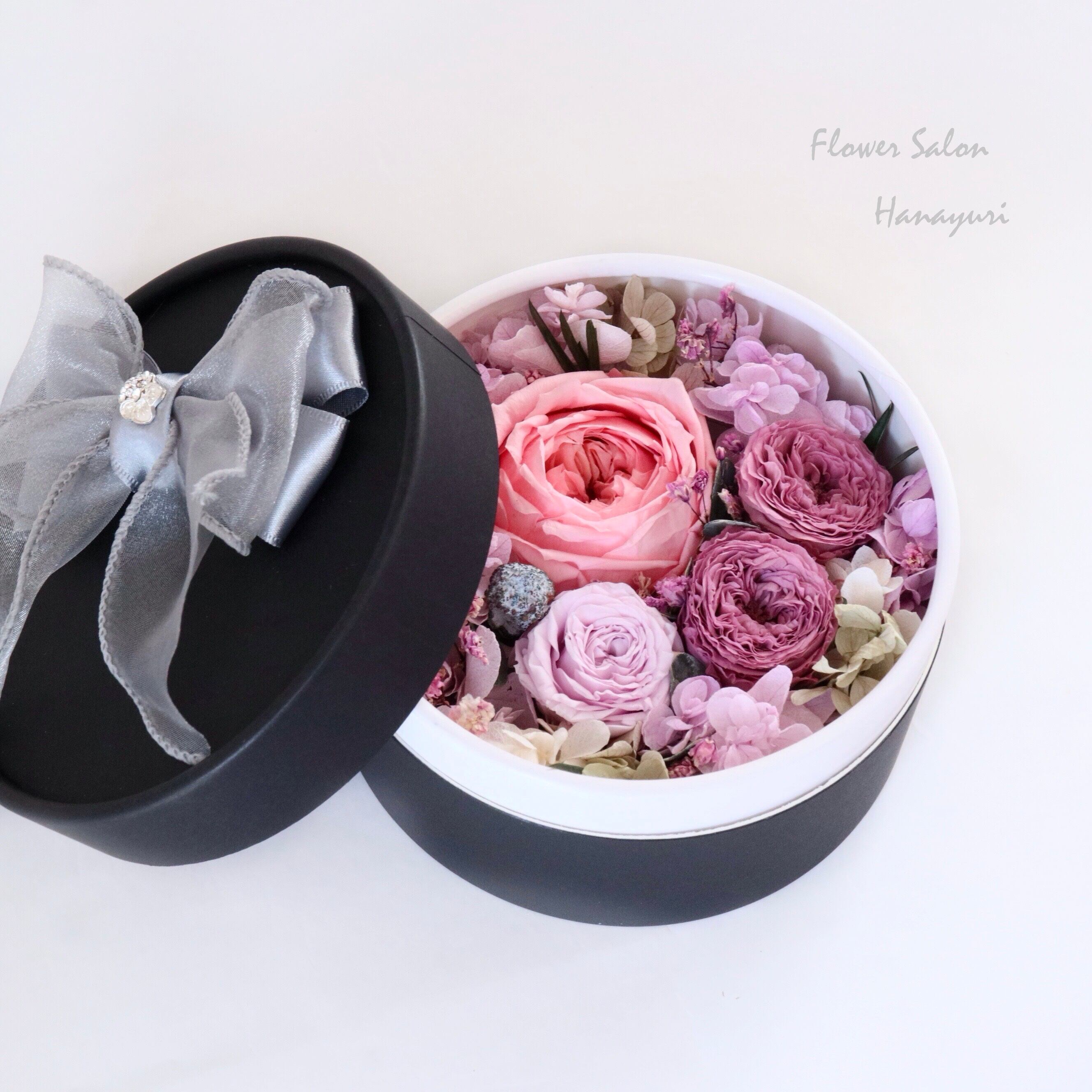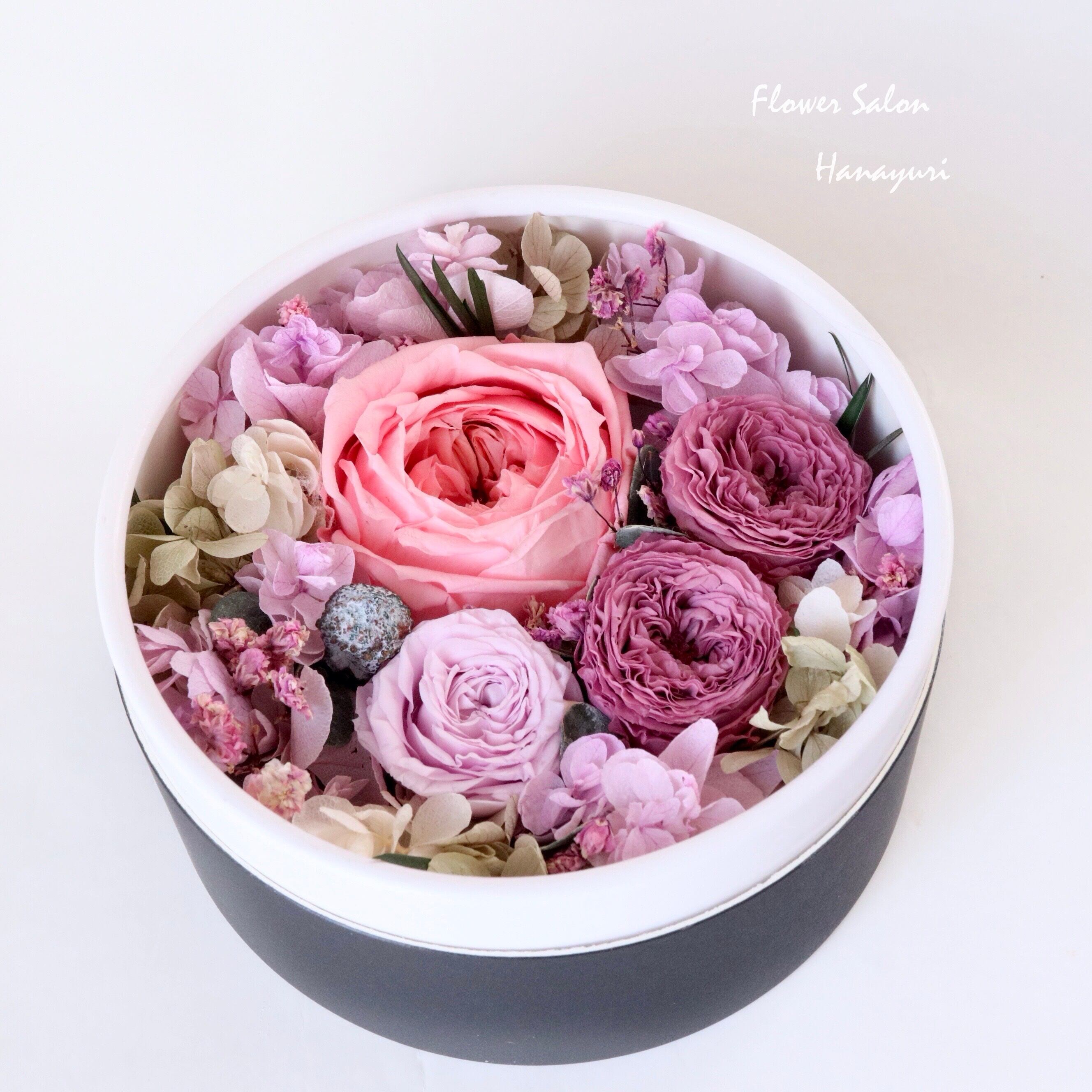 プリザーブドフラワー 丸ボックスアレンジ フラワーボックス ボックスフラワー ピンク紫系